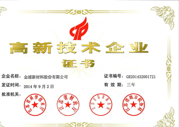 在公司領(lǐng)導(dǎo)的關(guān)心及各部門的通力合作下,金浦新材第三次獲得“高新技術(shù)企業(yè)”榮譽(yù)稱號(hào),證書編號(hào):GR201432001721,發(fā)證時(shí)間為2014年9月2日,有效期三年。在此期間,公司將繼續(xù)按15%的優(yōu)惠稅率繳納企業(yè)所得稅,并享受國(guó)家其他有關(guān)高新技術(shù)企業(yè)的優(yōu)惠政策。